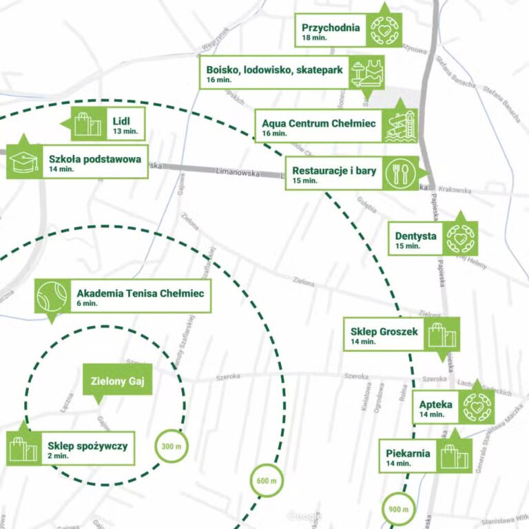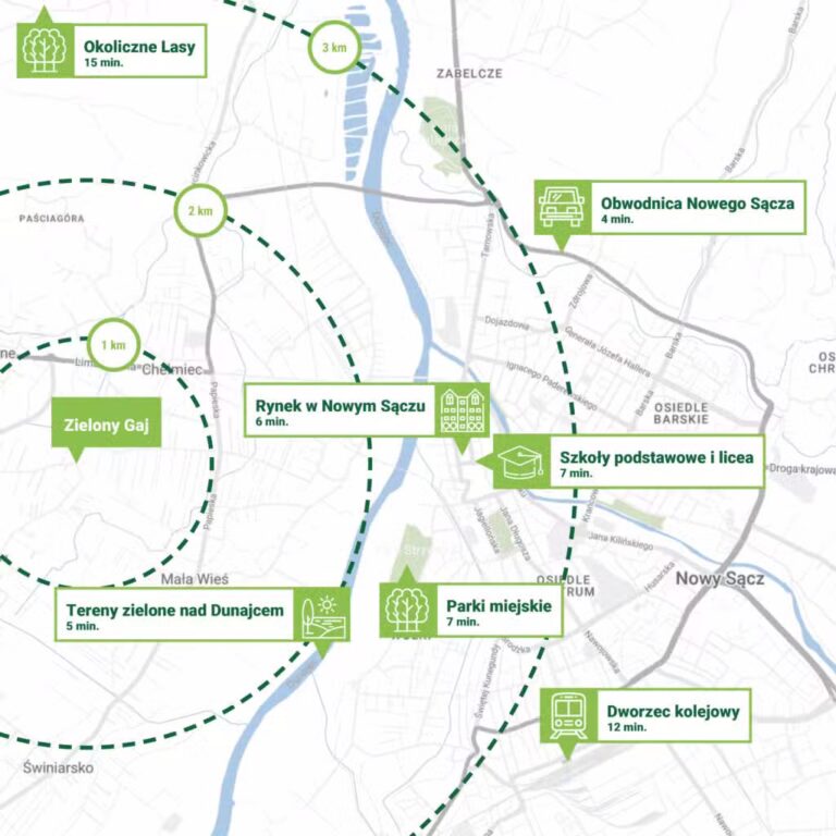 Duża zaleta lokalizacji Zielonego Gaju to komfortowy dostęp do pełnej infrastruktury miasta. Okolica jest świetnie skomunikowana. Niedaleko znajduje się m.in. wjazd na obwodnicę Nowego Sącza oraz kilka kluczowych tras dojazdowych – szybko możesz dotrzeć do pracy, placówek edukacyjno-opiekuńczych, popularnych marketów czy miejsc rekreacji i wypoczynku. Jeśli akurat nie dysponujesz samochodem, możesz skorzystać z pobliskich przystanków komunikacji miejskiej i busów prywatnych przewoźników. Na uwagę zasługuje również rozbudowana, stale poszerzająca się sieć ścieżek rowerowych oraz rekreacyjno-przyrodniczych (np. trasa Miodnego Szlaku), znajdująca się w pobliżu osiedla.