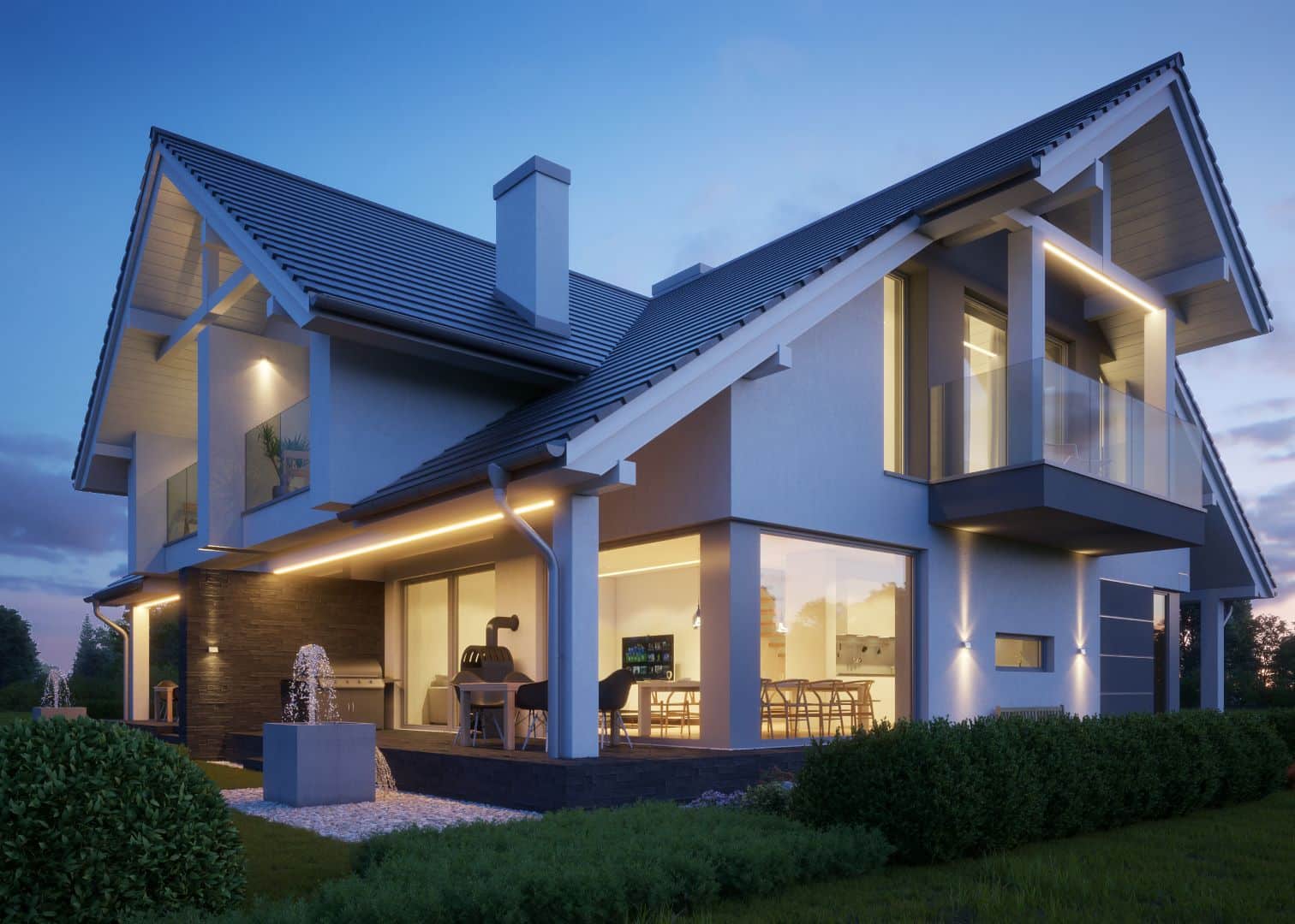 Zagospodarowany ogrodzony ogród , dwa tarasy obłożone kamieniem; dom na zewnątrz oświetlony. Wiele akcentów małej architektury m.in. elementy kamienia dekoracyjnego na elewacji domu.