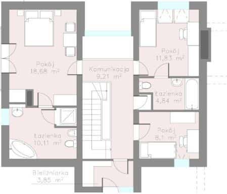 Na piętrze trzy sypialnie, pełna łazienka i salon kąpielowy. Sypialnia małżeńska z wyjściem na balkon, z miejscem na garderobę dla niej i dla niego. Dwie sypialnie z łazienka wbudowaną pomiędzy, z miejscem na zabudowę garderoby; okna dachowe z lukarną. Cały dom bardzo dobrze naświetlony światłem dziennym, z myślą o stworzeniu Domu Inteligentnego.