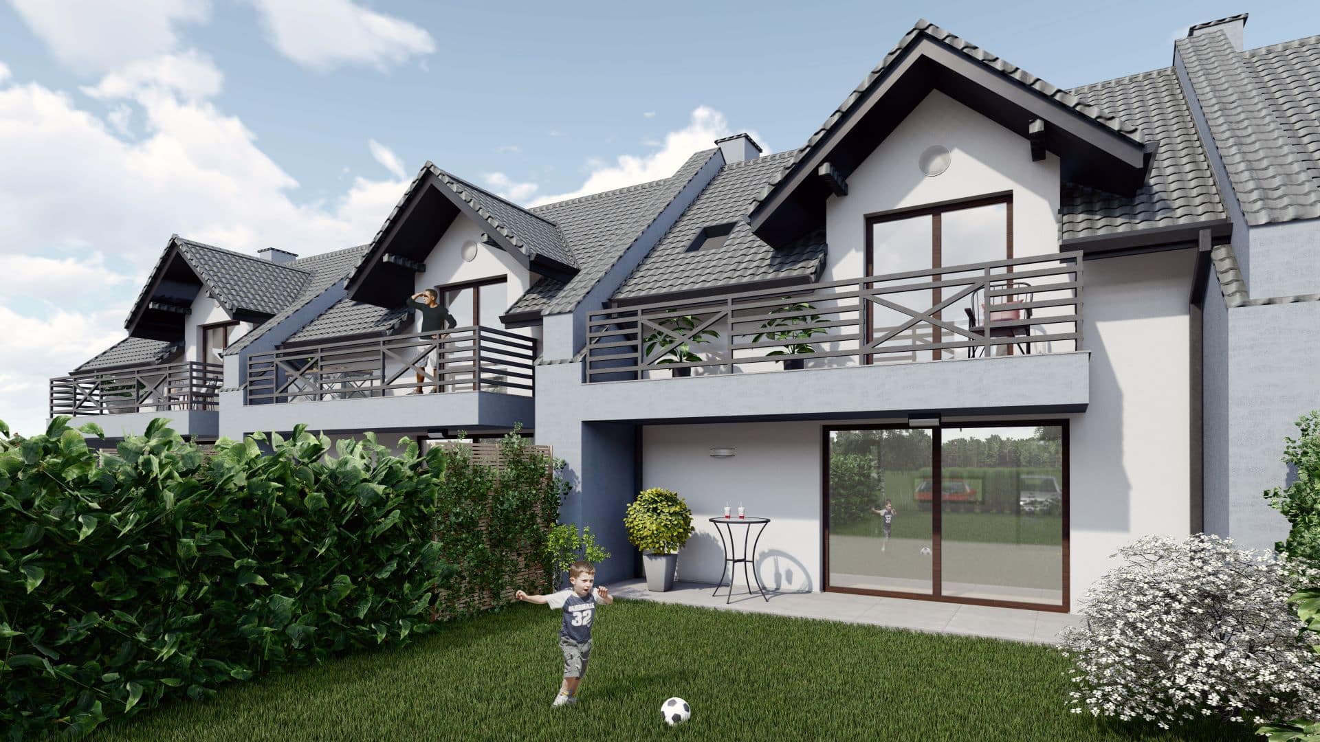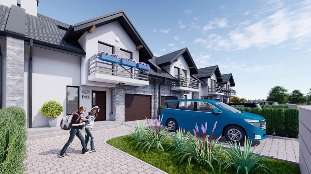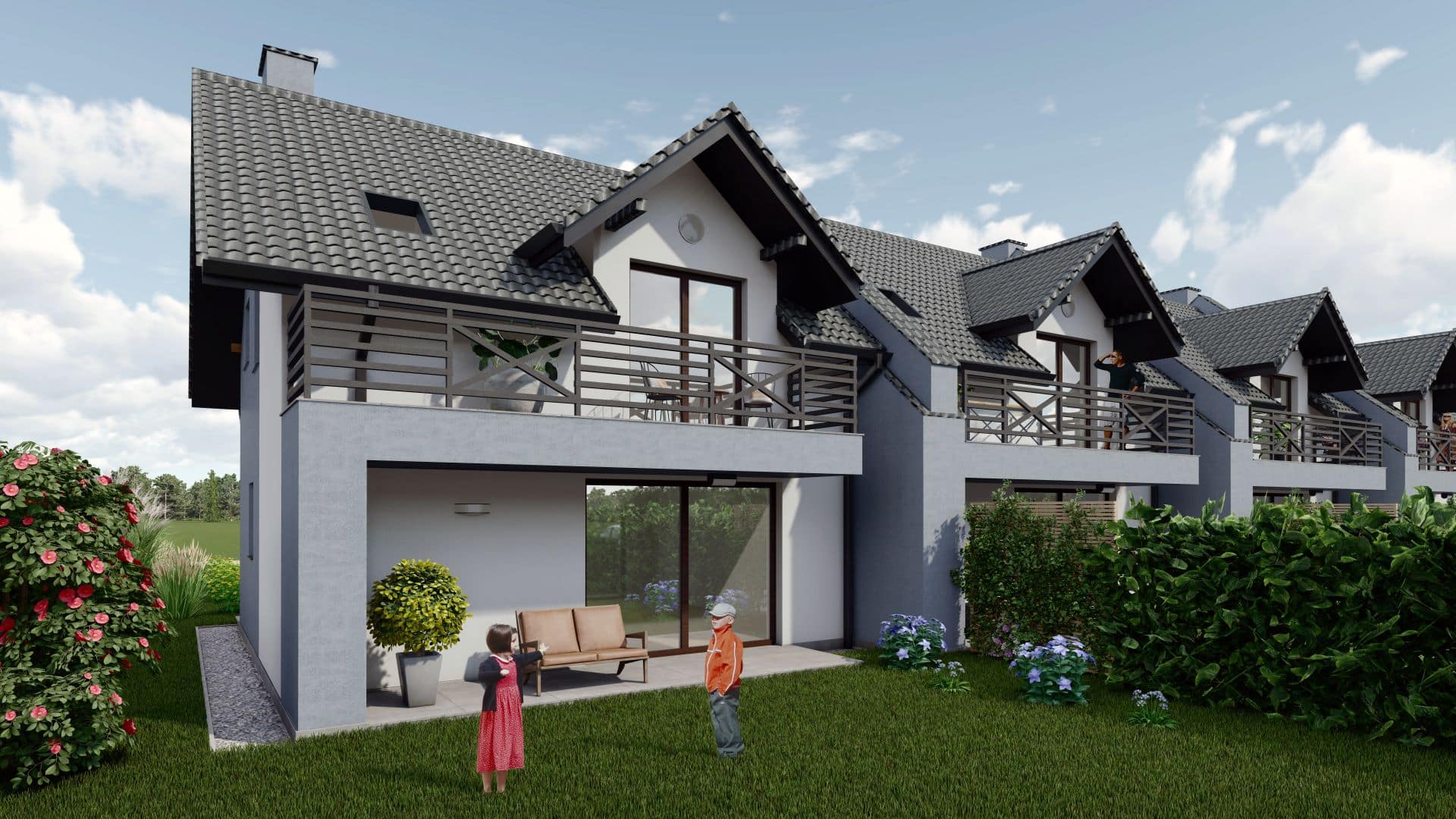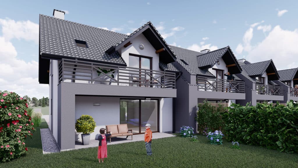 Na terenie Zielonego Gaju znajduje się m.in. 12 przestronnych domów w zabudowie szeregowej. Nowoczesne segmenty to idealny wybór dla osób ceniących sobie większą przestrzeń mieszkalną oraz dostęp do komfortowego, prywatnego ogródka. Wyróżnia je bardzo funkcjonalny układ pomieszczeń. Każdy z domów zachwyca otwartą panoramiczną kuchnią i przestronnym salonem z wyjściem na taras, gdzie można odpocząć blisko natury. Na poddaszu znajdują się trzy pokoje z dużą łazienką i balkonem, z którego rozciąga się piękny widok na górskie pasma.