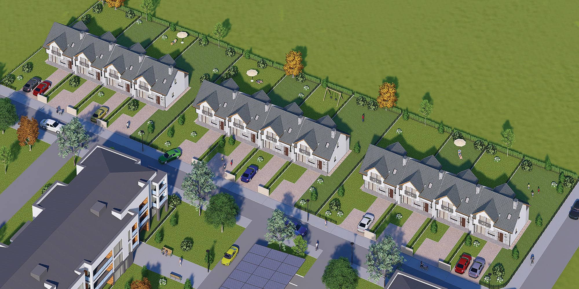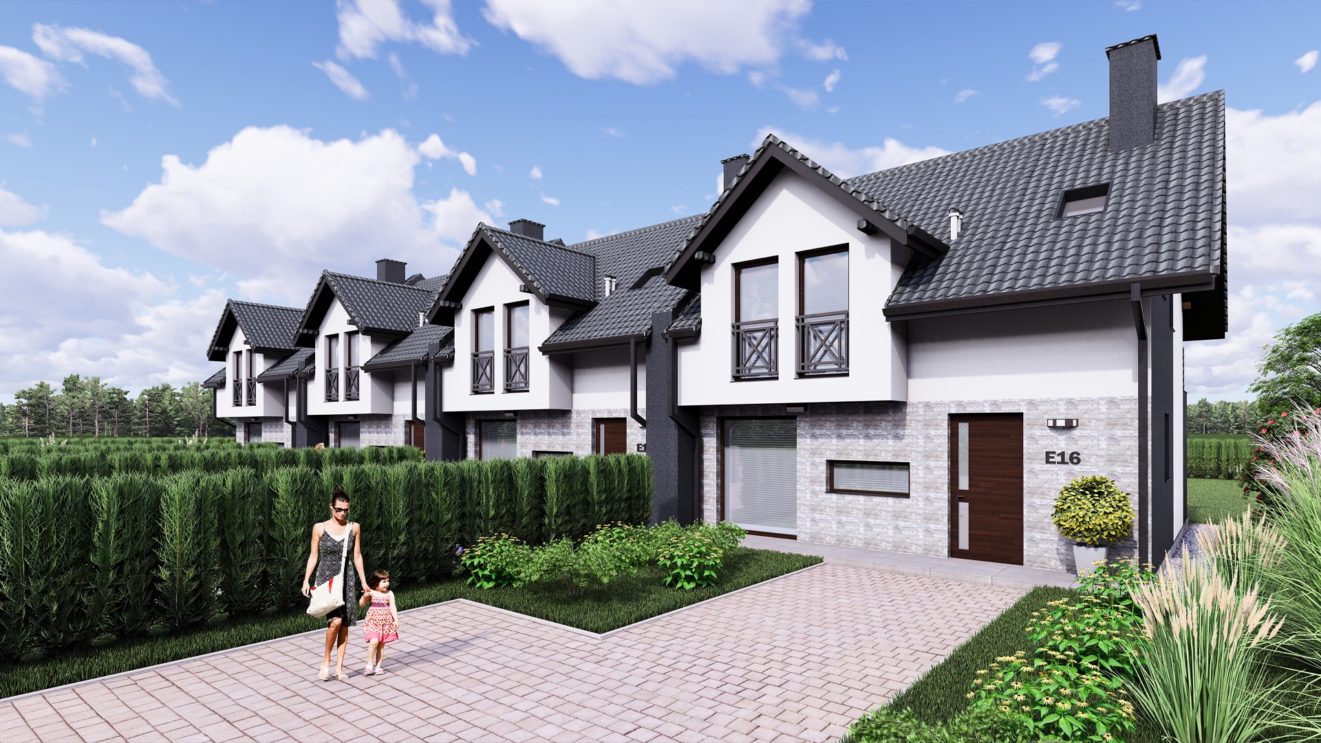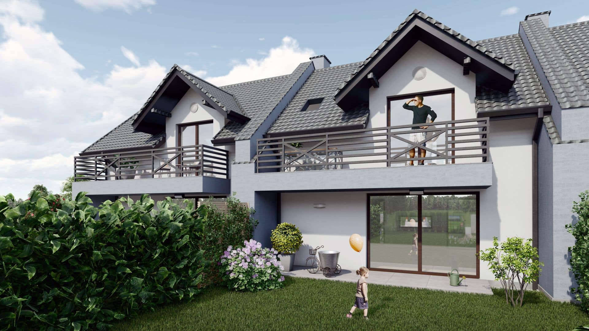 Na terenie Zielonego Gaju znajduje się m.in. 12 przestronnych domów w zabudowie szeregowej. Nowoczesne segmenty to idealny wybór dla osób ceniących sobie większą przestrzeń mieszkalną oraz dostęp do komfortowego, prywatnego ogródka. Wyróżnia je bardzo funkcjonalny układ pomieszczeń. Każdy z domów zachwyca otwartą panoramiczną kuchnią i przestronnym salonem z wyjściem na taras, gdzie można odpocząć blisko natury. Na poddaszu znajdują się trzy pokoje z dużą łazienką i balkonem, z którego rozciąga się piękny widok na górskie pasma.