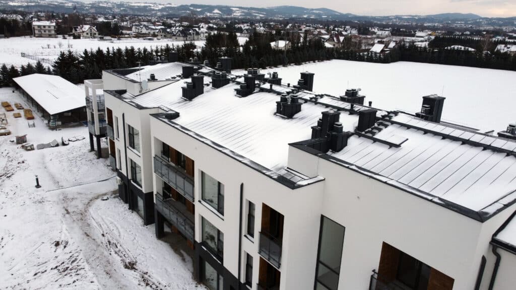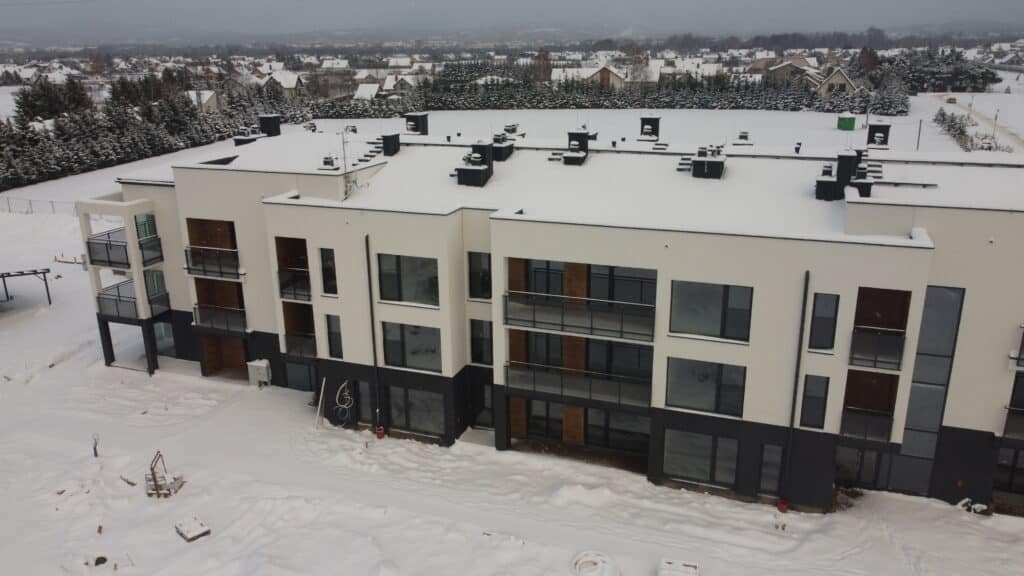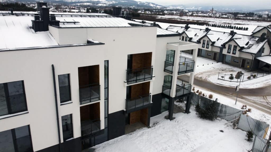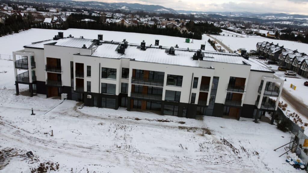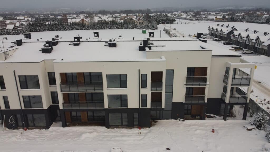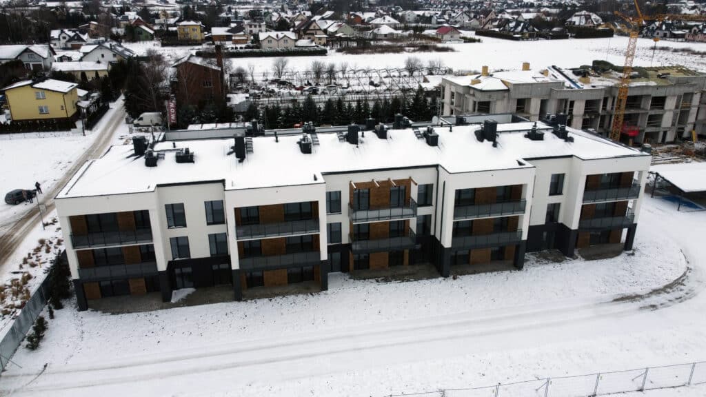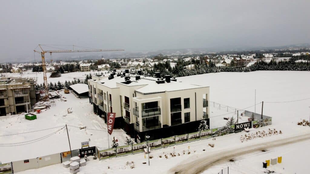 Przedstawiamy pierwsze zimowe ujęcia z placu budowy bloków wielorodzinnych❗ Nawet podczas białej pory roku i trudniejszych warunków atmosferycznych, prace postępują przy wykańczaniu inwestycji.