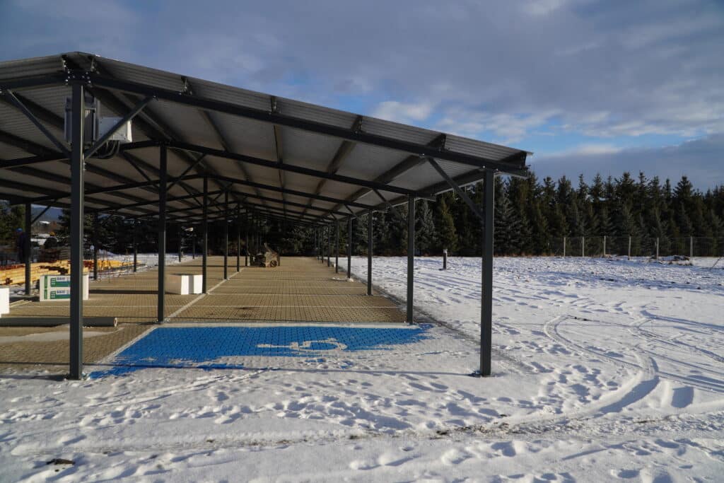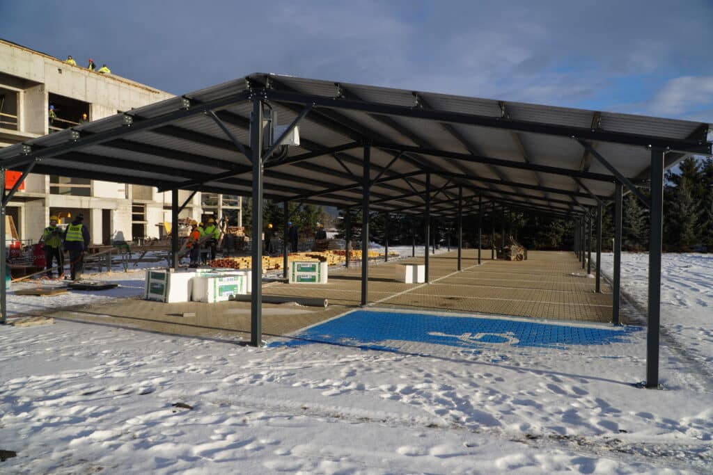 Etap prac wykończeniowych zewnętrznych drugiego bloku wielorodzinnego został zrealizowany. Wykonano montaż balustrad i obróbek blacharskich. Tarasy w ogródkach oraz obrzeża wokół budynku, zostały uzupełnione betonową kostką. Ukończono również budowę chodnika oraz parkingu przynależącego do bloku. Obszar placu został utwardzony, a zadaszenie zamontowane na przygotowanej wcześniej stalowej konstrukcji.